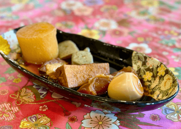 天ぷら・かまぼこ・ちくわ・わかめ・とろろ・ネギが入っています。
